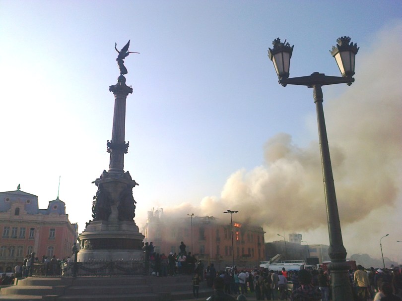 En esa tarde siniestra la llamada de mi amigo Armando Joyuén me puso en alerta, al llegar a la plaza el cuadro era pavoroso: los bomberos multiplicaban sus esfuerzos para apagar varios focos de fuego, la mansarda de la casona se caía a pedazos mientras era consumida por las llamas, al frente una multitud comentaba, se lamentaba, bromeaba. Ante nuestros ojos la desgracia ponía en jaque a una de las plazas más bellas de Latinoamérica.